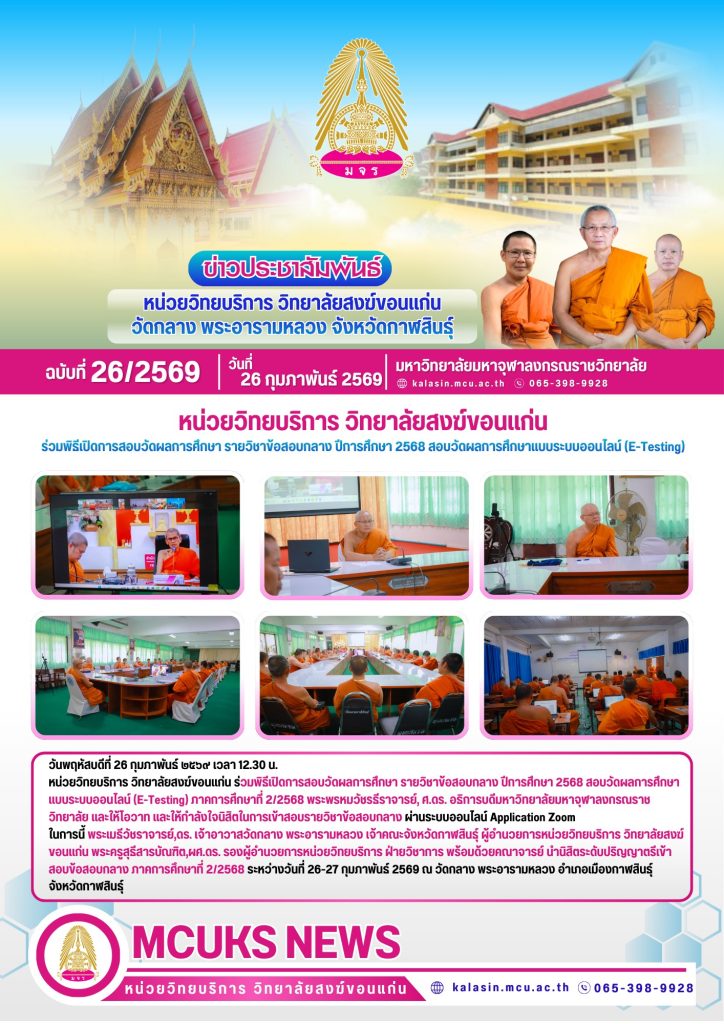 หน่วยวิทยบริการ วิทยาลัยสงฆ์ขอนแก่น ร่วมพิธีเปิดการสอบวัดผลการศึกษา รายวิชาข้อสอบกลาง ปีการศึกษา 2568 สอบวัดผลการศึกษาแบบระบบออนไลน์ (E-Testing) ภาคการศึกษาที่ 2/2568 พระพรหมวัชรธีราจารย์, ศ.ดร. อธิการบดีมหาวิทยาลัยมหาจุฬาลงกรณราชวิทยาลัย และให้โอวาท และให้กำลังใจนิสิตในการเข้าสอบรายวิชาข้อสอบกลาง ผ่านระบบออนไลน์ Application Zoom