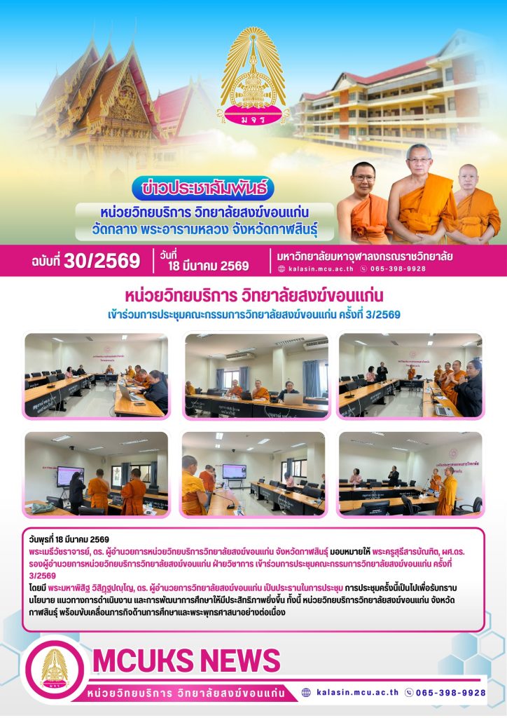 พระเมธีวัชราจารย์, ดร. ผู้อำนวยการหน่วยวิทยบริการวิทยาลัยสงฆ์ขอนแก่น จังหวัดกาฬสินธุ์ มอบหมายให้ พระครูสุธีสารบัณฑิต, ผศ.ดร. รองผู้อำนวยการหน่วยวิทยบริการวิทยาลัยสงฆ์ขอนแก่น ฝ่ายวิชาการ เข้าร่วมการประชุมคณะกรรมการวิทยาลัยสงฆ์ขอนแก่น ครั้งที่ 3/2569