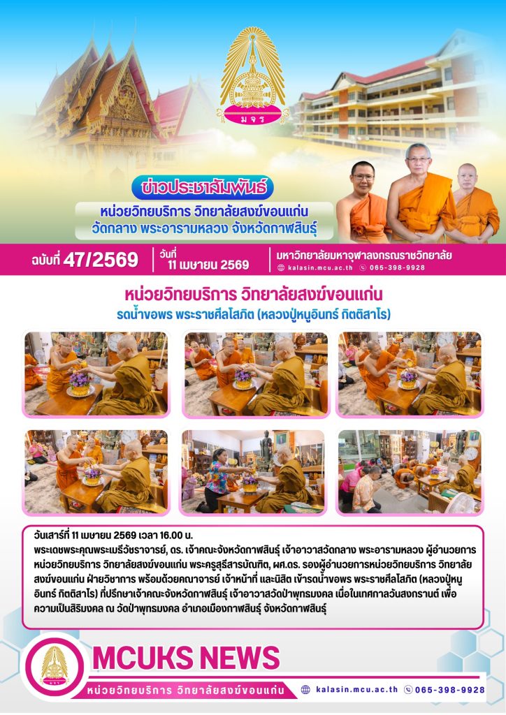 หน่วยวิทยบริการ วิทยาลัยสงฆ์ขอนแก่น เข้ารดน้ำขอพร พระราชศีลโสภิต (หลวงปู่หนูอินทร์ กิตติสาโร) ที่ปรึกษาเจ้าคณะจังหวัดกาฬสินธุ์