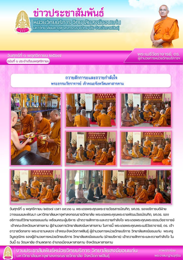 หน่วยวิทยบริการ วิทยาลัยสงฆ์ขอนแก่น เข้าถวายสักการะและถวายกำลังใจ พระเดชพระคุณพระธรรมวัชราจารย์ เจ้าคณะจังหวัดมหาสารคาม ผู้อำนวยการวิทยาลัยสงฆ์มหาสารคาม