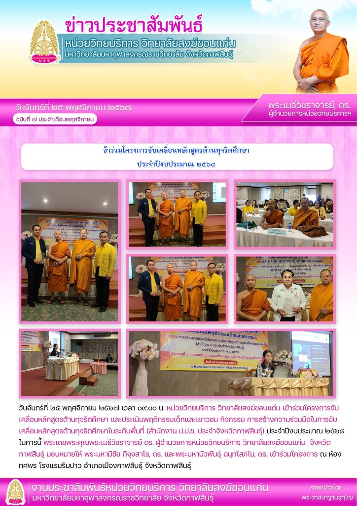 หน่วยวิทยบริการ วิทยาลัยสงฆ์ขอนแก่น เข้าร่วมโครงการขับเคลื่อนหลักสูตรต้านทุจริตศึกษา และประเมินพฤติกรรมเด็กและเยาวชน กิจกรรม การสร้างความร่วมมือในการขับเคลื่อนหลักสูตรต้านทุจริตศึกษาในระดับพื้นที่ (สำนักงาน ป.ป.ช. ประจำจังหวัดกาฬสินธุ์) ประจำปีงบประมาณ ๒๕๖๘