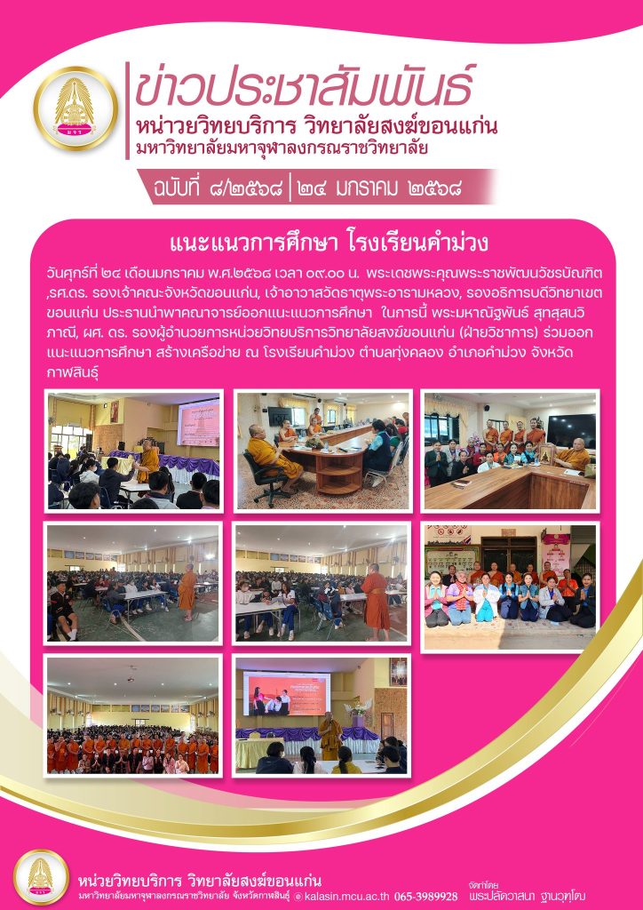 ในการนี้ พระมหาณัฐพันธ์ สุทสฺสนวิภาณี, ผศ. ดร. รองผู้อำนวยการหน่วยวิทยบริการ วิทยาลัยสงฆ์ขอนแก่น (ฝ่ายวิชาการ) ร่วมออกแนะแนวการศึกษา สร้างเครือข่าย ณ โรงเรียนคำม่วง ตำบลทุ่งคลอง อำเภอคำม่วง จังหวัดกาฬสินธุ์