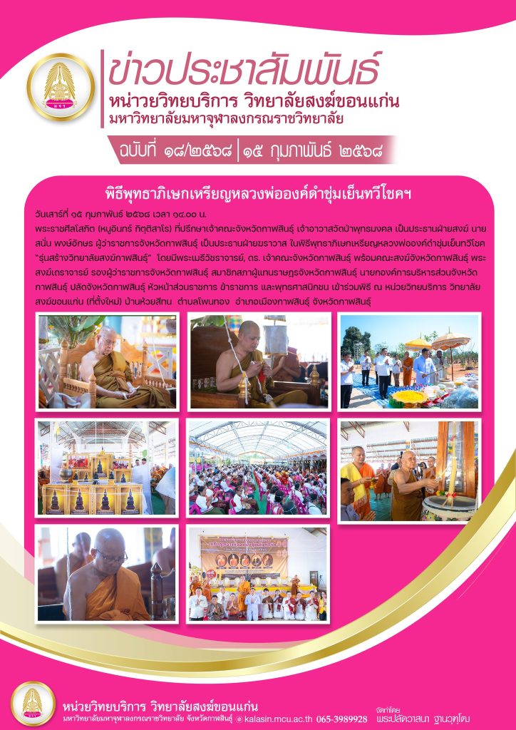 โดยมี พระเมธีวัชราจารย์,ดร. เจ้าคณะจังหวัดกาฬสินธุ์ เจาอาวาสวัดกลาง พระอารามหลวง ผู้อำนวยการหน่วยวิทยบริการ วิทยาลัยสงฆ์ขอนแก่น พร้อมคณะสงฆ์จังหวัดกาฬสินธุ์ พระสงฆ์เถราจารย์ รองผู้ว่าราชการจังหวัดกาฬสินธุ์ สมาชิกสภาผู้แทนราษฎรจังหวัดกาฬสินธุ์ นายกองค์การบริหารส่วนจังหวัดกาฬสินธุ์ ปลัดจังหวัดกาฬสินธุ์ หัวหน้าส่วนราชการ ข้าราชการ และพุทธศาสนิกชน เข้าร่วมพิธี ณ หน่วยวิทยบริการ วิทยาลัยสงฆ์ขอนแก่น (ที่ตั้งใหม่) บ้านห้วยสีทน ตำบลโพนทอง อำเภอเมืองกาฬสินธุ์ จังหวัดกาฬสินธุ์