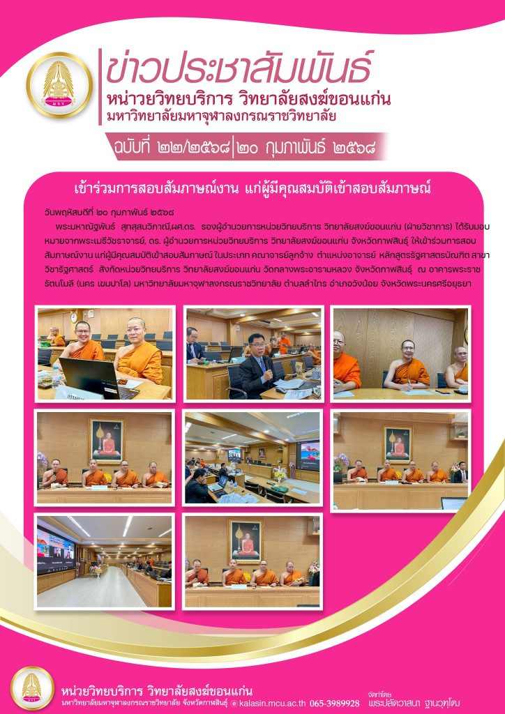 หน่วยวิทยบริการ วิทยาลัยสงฆ์ขอนแก่น เข้าร่วมการสอบสัมภาษณ์งาน แก่ผู้มีคุณสมบัติเข้าสอบสัมภาษณ์ ในประเภท คณาจารย์ลูกจ้าง ตำแหน่งอาจารย์ หลักสูตรรัฐศาสตรบัณฑิต สาขาวิชารัฐศาสตร์ สังกัดหน่วยวิทยบริการ วิทยาลัยสงฆ์ขอนแก่น