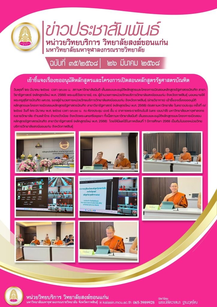 ทั้งนี้สภามหาวิทยาลัยมีมติ เห็นชอบและอนุมัติหลักสูตรและโครงการเปิดสอนหลักสูตรรัฐศาสตรบัณฑิต สาขาวิชารัฐศาสตร์ (หลักสูตรใหม่ พ.ศ. 2568) โดยให้มีผลใช้ในภาคเรียนที่ ๑ ปีการศึกษา ๒๕๖๘ เป็นต้นไปของหน่วยวิทยบริการวิทยาลัยสงฆ์ขอนแก่น จังหวัดกาฬสินธุ์