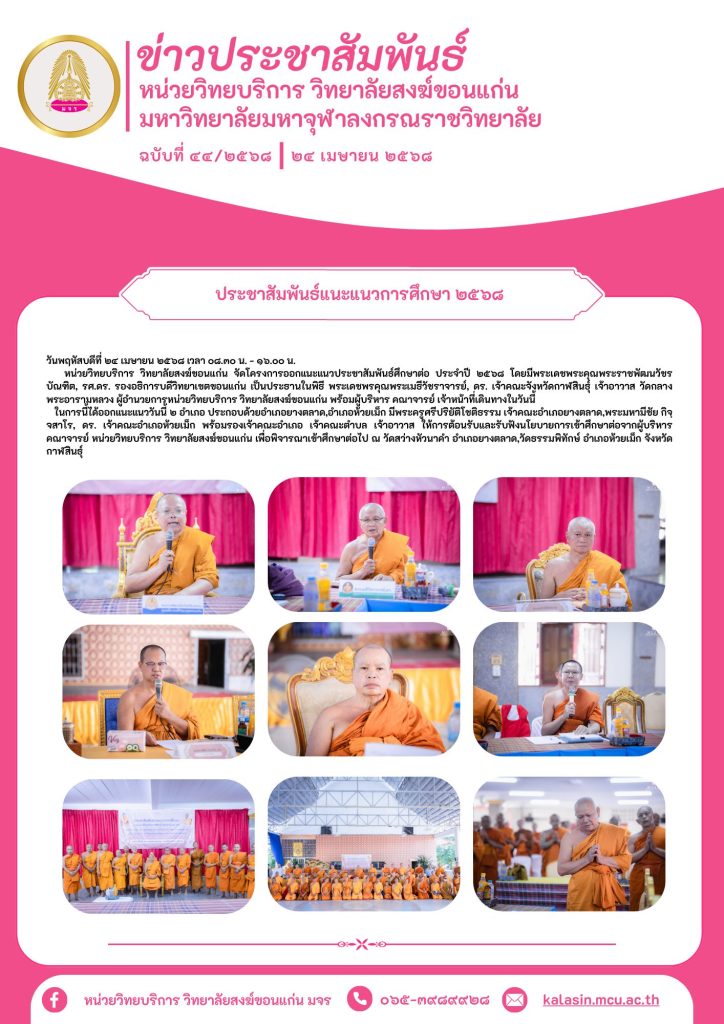 หน่วยวิทยบริการ วิทยาลัยสงฆ์ขอนแก่น จัดโครงการออกแนะแนวประชาสัมพันธ์ศึกษาต่อ ประจำปี ๒๕๖๘ โดยมีพระเดชพระคุณพระราชพัฒนวัชรบัณฑิต, รศ.ดร. รองอธิการบดีวิทยาเขตขอนแก่น เป็นประธานในพิธี พระเดชพรคุณพระเมธีวัชราจารย์, ดร. เจ้าคณะจังหวัดกาฬสินธุ์ เจ้าอาวาส วัดกลาง พระอารามหลวง ผู้อำนวยการหน่วยวิทยบริการ วิทยาลัยสงฆ์ขอนแก่น พร้อมผู้บริหาร คณาจารย์ เจ้าหน้าที่เดินทางในวันนี้