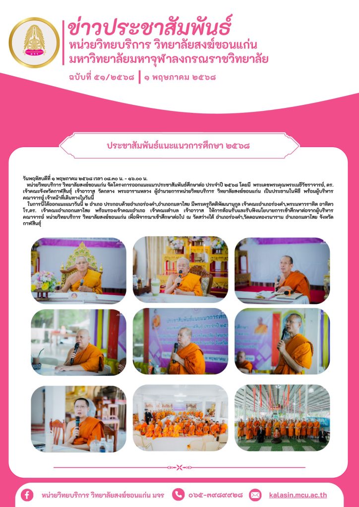 หน่วยวิทยบริการ วิทยาลัยสงฆ์ขอนแก่น จัดโครงการออกแนะแนวประชาสัมพันธ์ศึกษาต่อ ประจำปี ๒๕๖๘ อำเภอร่องคำ,อำเภอกมลาไสย