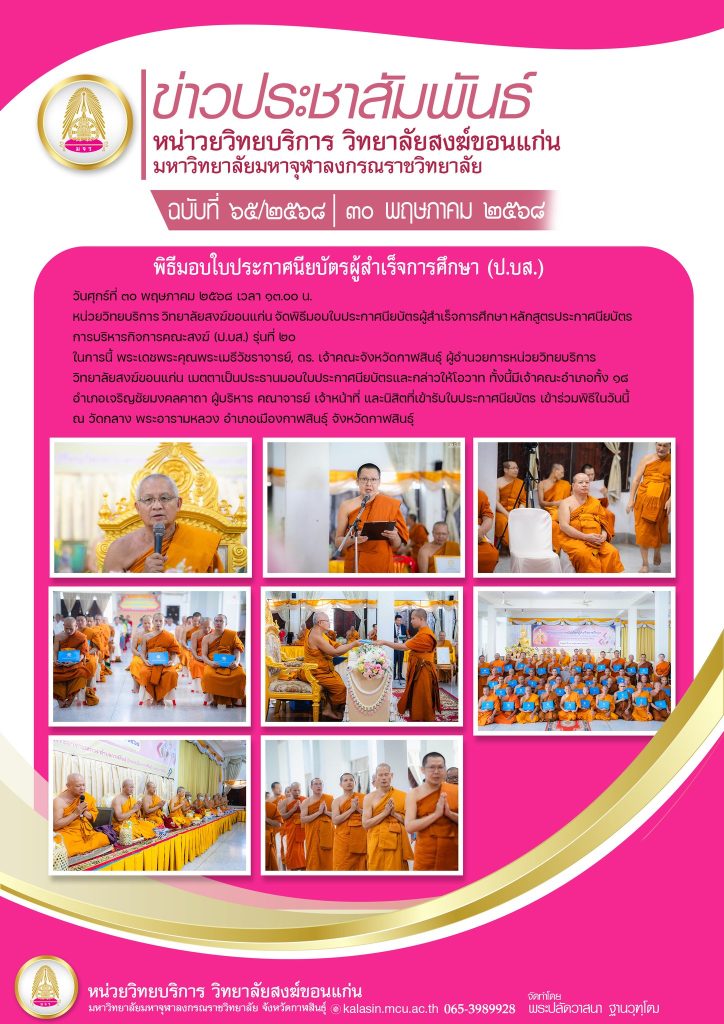 หน่วยวิทยบริการ วิทยาลัยสงฆ์ขอนแก่น จัดพิธีมอบใบประกาศนียบัตรผู้สำเร็จการศึกษา หลักสูตรประกาศนียบัตรการบริหารกิจการคณะสงฆ์ (ป.บส.) รุ่นที่ ๒๐