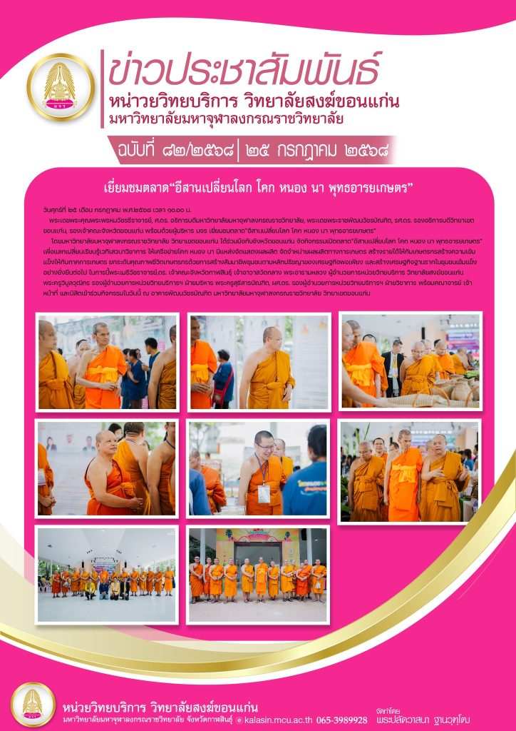 โดยมหาวิทยาลัยมหาจุฬาลงกรณราชวิทยาลัย วิทยาเขตขอนแก่น ได้ร่วมมือกับจังหวัดขอนแก่น จัดกิจกรรมเปิดตลาด“อีสานเปลี่ยนโลก โคก หนอง นา พุทธอารยเกษตร” เพื่อแลกเปลี่ยนเรียนรู้เวทีเสวนาวิชาการ ให้เครือข่ายโคก หนอง นา มีแหล่งจัดแสดงผลผลิต จัดจำหน่ายผลผลิตทางการเกษตร สร้างรายได้ให้กับเกษตรกรสร้างความเข้มแข็งให้กับภาคการเกษตร ยกระดับคุณภาพชีวิตเกษตรกรด้วยการสร้างสัมมาชีพชุมชนตามหลักปรัชญาของเศรษฐกิจพอเพียง และสร้างเศรษฐกิจฐานรากในชุมชนเข้มแข็งอย่างยั่งยืนต่อไป