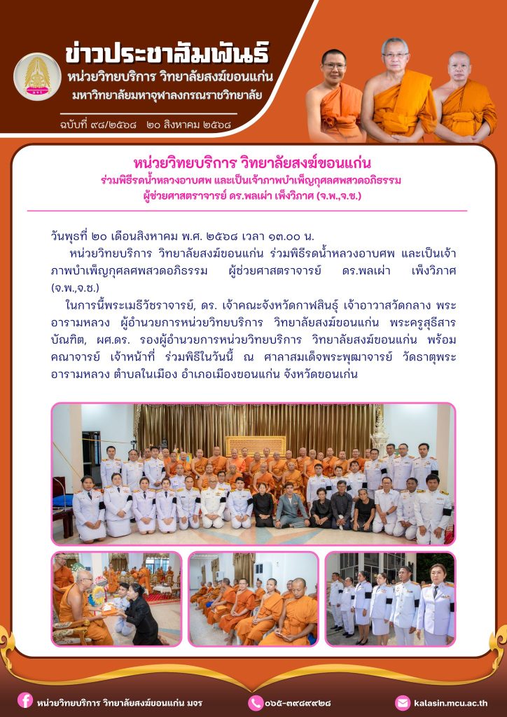 หน่วยวิทยบริการ วิทยาลัยสงฆ์ขอนแก่น ร่วมพิธีรดน้ำหลวงอาบศพ และเป็นเจ้าภาพบำเพ็ญกุศลศพสวดอภิธรรม ผู้ช่วยศาสตราจารย์ ดร.พลเผ่า เพ็งวิภาศ