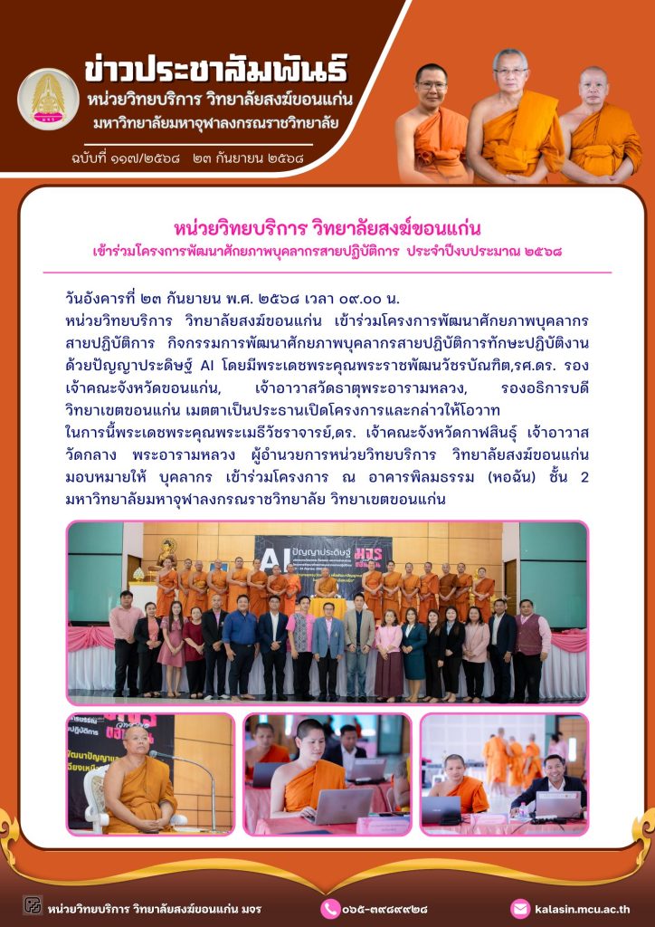 หน่วยวิทยบริการ วิทยาลัยสงฆ์ขอนแก่น เข้าร่วมโครงการพัฒนาศักยภาพบุคลากรสายปฏิบัติการ กิจกรรมการพัฒนาศักยภาพบุคลากรสายปฏิบัติการทักษะปฏิบัติงานด้วยปัญญาประดิษฐ์ AI โดยมีพระเดชพระคุณพระราชพัฒนวัชรบัณฑิต,รศ.ดร. รองเจ้าคณะจังหวัดขอนแก่น, เจ้าอาวาสวัดธาตุพระอารามหลวง, รองอธิการบดีวิทยาเขตขอนแก่น เมตตาเป็นประธานเปิดโครงการและกล่าวให้โอวาท