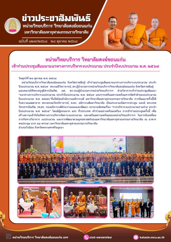 พระเมธีวัชราจารย์, ดร.ผู้อำนวยการหน่วยวิทยบริการวิทยาลัยสงฆ์ขอนแก่น จังหวัดกาฬสินธุ์ มอบหมายให้พระครูสุธีสารบัณฑิต, ผศ. ดร.รองผู้อำนวยการหน่วยวิทยบริการฯ ฝ่ายวิชาการเข้าร่วมประชุมสัมมนา “แนวทางการบริหารงบประมาณ ประจำปีงบประมาณ พ.ศ. ๒๕๖๙ และการเตรียมความพร้อมการจัดทำคำของบประมาณ ปีงบประมาณ พ.ศ. ๒๕๗๐”ซึ่งจัดโดยสำนักงานอธิการบดี มหาวิทยาลัยมหาจุฬาลงกรณราชวิทยาลัย การสัมมนาครั้งนี้ได้รับความเมตตาจาก พระพรหมวัชรธีราจารย์, ศ.ดร. อธิการบดีมหาวิทยาลัย เป็นประธานเปิดการประชุม และมี พระเทพวัชรสารบัณฑิต, รศ.ดร. รองอธิการบดีฝ่ายวางแผนและพัฒนา บรรยายพิเศษเรื่อง “การบริหารงบประมาณรายจ่าย ประจำปีงบประมาณ พ.ศ. ๒๕๖๙” โดยมีผู้แทนจาก มจร ทั่วประเทศ เข้าร่วมอย่างพร้อมเพรียง การเข้าร่วมประชุมครั้งนี้ เพื่อสร้างความเข้าใจในทิศทางการบริหารจัดการงบประมาณ และเตรียมความพร้อมของหน่วยวิทยบริการฯ ในการขับเคลื่อนภารกิจทางวิชาการ งบประมาณ และการพัฒนาตามยุทธศาสตร์ของมหาวิทยาลัยมหาจุฬาลงกรณราชวิทยาลัย ณ อาคารหอประชุม มวก ๔๘ พรรษา มหาวิทยาลัยมหาจุฬาลงกรณราชวิทยาลัย อำเภอวังน้อย จังหวัดพระนครศรีอยุธยา