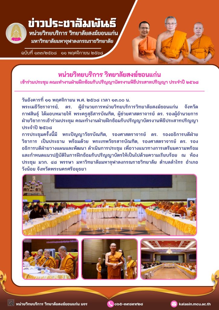 พระเมธีวัชราจารย์, ดร. ผู้อำนวยการหน่วยวิทยบริการวิทยาลัยสงฆ์ขอนแก่น จังหวัดกาฬสินธุ์ ได้มอบหมายให้ พระครูสุธีสารบัณฑิต, ผู้ช่วยศาสตราจารย์ ดร. รองผู้อำนวยการฝ่ายวิชาการเข้าร่วมประชุม คณะทำงานฝ่ายฝึกซ้อมรับปริญญาบัตรงานพิธีประสาทปริญญา ประจำปี ๒๕๖๘
