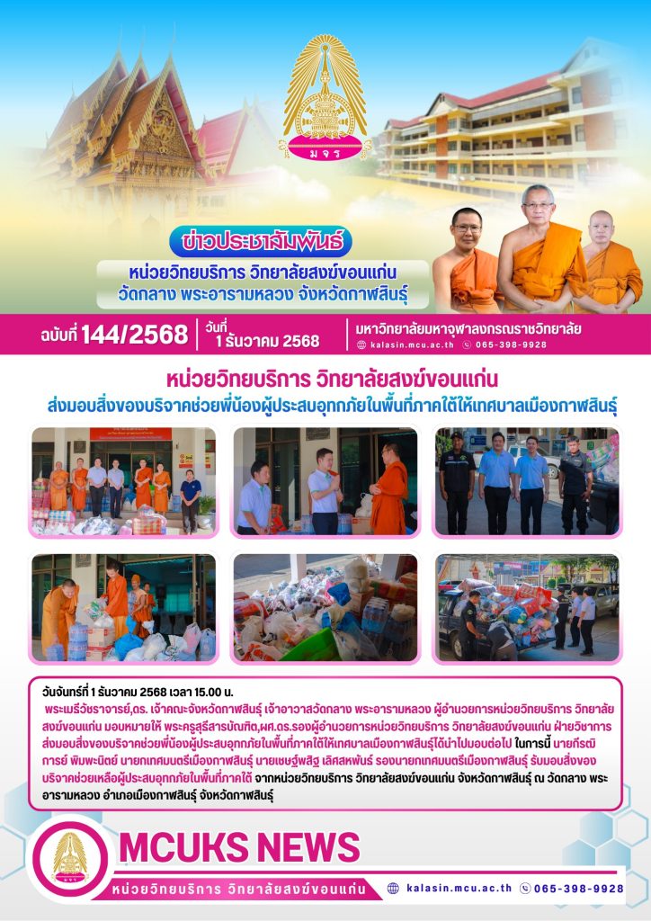 หน่วยวิทยบริการ วิทยาลัยสงฆ์ขอนแก่น ส่งมอบสิ่งของบริจาคช่วยพี่น้องผู้ประสบอุทกภัยในพื้นที่ภาคใต้ให้เทศบาลเมืองกาฬสินธุ์