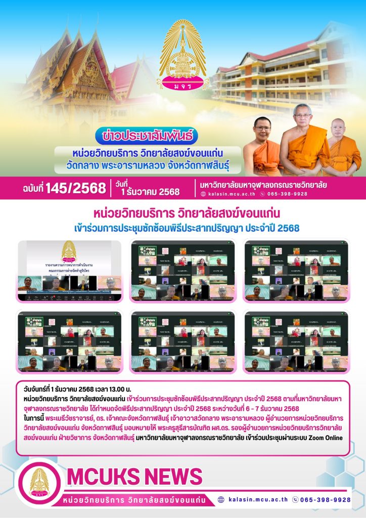 หน่วยวิทยบริการ วิทยาลัยสงฆ์ขอนแก่น เข้าร่วมการประชุมซักซ้อมพิธีประสาทปริญญา ประจำปี 2568 ตามที่มหาวิทยาลัยมหาจุฬาลงกรณราชวิทยาลัย ได้กำหนดจัดพิธีประสาทปริญญา ประจำปี 2568 ระหว่างวันที่ 6 – 7 ธันวาคม 2568