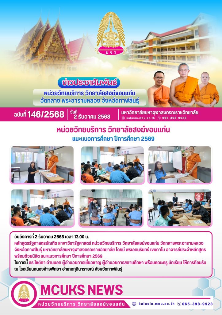 หลักสูตรรัฐศาสตรบัณฑิต สาขาวิชารัฐศาสตร์ หน่วยวิทยบริการ วิทยาลัยสงฆ์ขอนแก่น วัดกลางพระอารามหลวง จังหวัดกาฬสินธุ์ มหาวิทยาลัยมหาจุฬาลงกรณราชวิทยาลัย โดยมี พรเอกนรินทร์ เขมกาโม อาจารย์ประจำหลักสูตร พร้อมด้วยนิสิต แนะแนวการศึกษา ปีการศึกษา 2569