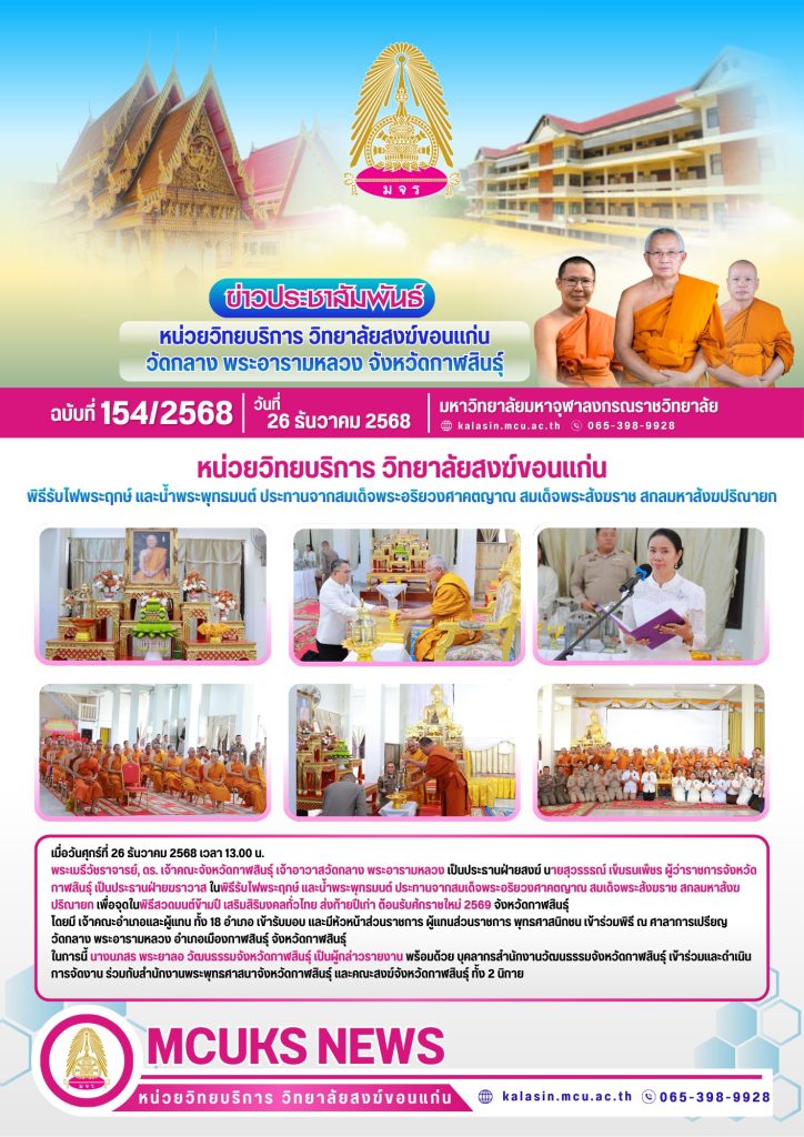 พิธีรับไฟพระฤกษ์ และน้ำพระพุทธมนต์ ประทานจากสมเด็จพระอริยวงศาคตญาณ สมเด็จพระสังฆราช สกลมหาสังฆปริณายก เพื่อจุดในพิธีสวดมนต์ข้ามปี เสริมสิริมงคลทั่วไทย ส่งท้ายปีเก่า ต้อนรับศักราชใหม่ 2569 จังหวัดกาฬสินธุ์
