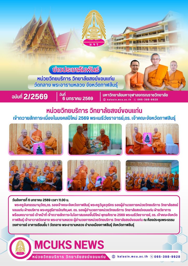 พระครูจันทธรรมานุวัตร,ดร. รองเจ้าคณะจังหวัดกาฬสินธุ์ พระครูวิบูลวุฒิกร รองผู้อำนวยการหน่วยวิทยบริการ วิทยาลัยสงฆ์ขอนแก่น ฝ่ายบริหาร พระครูสุธีสารบัณฑิต,ผศ. ดร. รองผู้อำนวยการหน่วยวิทยบริการ วิทยาลัยสงฆ์ขอนแก่น ฝ่ายวิชาการ พร้อมคณาจารย์ เจ้าหน้าที่ เข้าถวายสักการะในโอกาสมงคลขึ้นปีใหม่ พุทธศักราช 2569 พระเมธีวัชราจารย์, ดร. เจ้าคณะจังหวัดกาฬสินธุ์ เจ้าอาวาสวัดกลาง พระอารามหลวง ผู้อํานวยการหน่วยวิทยบริการ วิทยาลัยสงฆ์ขอนแก่น ณ ห้องประชุมพระธรรมวงศาจารย์ อาคารเรียนชั้น 1 วัดกลาง พระอารามหลวง อำเภอเมืองกาฬสินธุ์ จังหวัดกาฬสินธุ์