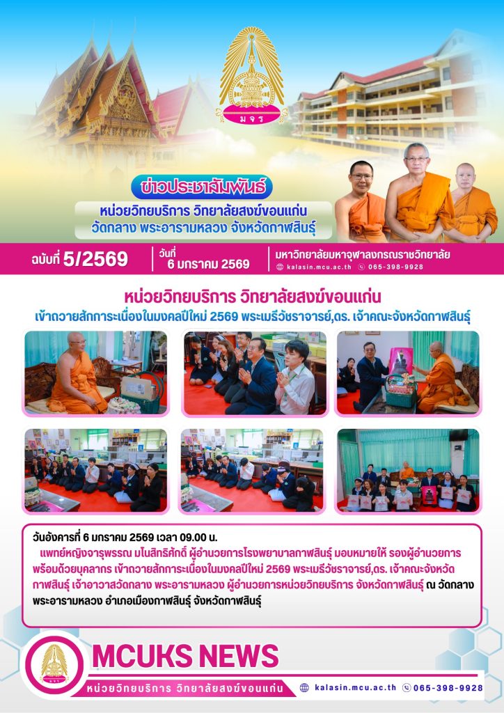 แพทย์หญิงจารุพรรณ มโนสิทธิศักดิ์ ผู้อำนวยการโรงพยาบาลกาฬสินธุ์ มอบหมายให้ รองผู้อำนวยการ พร้อมด้วยบุคลากร เข้าถวายสักการะเนื่องในมงคลปีใหม่ 2569 พระเมธีวัชราจารย์,ดร. เจ้าคณะจังหวัดกาฬสินธุ์ เจ้าอาวาสวัดกลาง พระอารามหลวง ผู้อำนวยการหน่วยวิทยบริการ จังหวัดกาฬสินธุ์ ณ วัดกลาง พระอารามหลวง อำเภอเมืองกาฬสินธุ์ จังหวัดกาฬสินธุ์