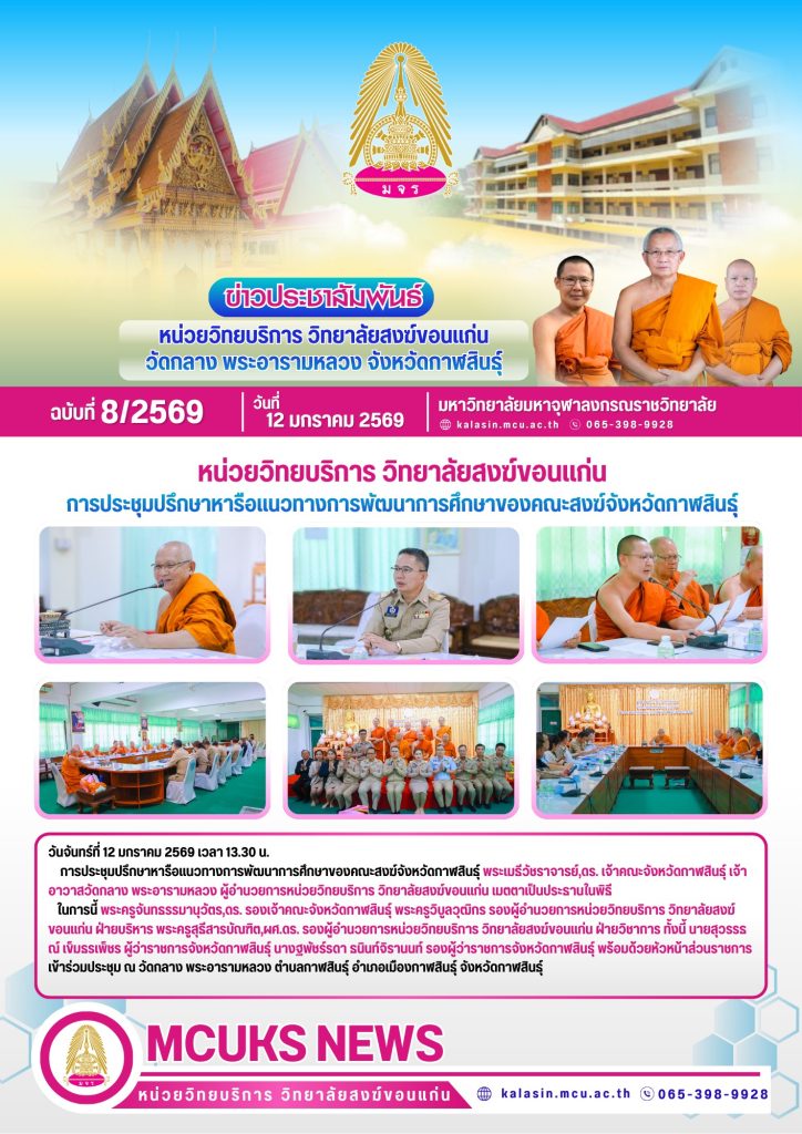 ในการนี้ พระครูจันทธรรมานุวัตร,ดร. รองเจ้าคณะจังหวัดกาฬสินธุ์ พระครูวิบูลวุฒิกร รองผู้อำนวยการหน่วยวิทยบริการ วิทยาลัยสงฆ์ขอนแก่น ฝ่ายบริหาร พระครูสุธีสารบัณฑิต,ผศ.ดร. รองผู้อำนวยการหน่วยวิทยบริการ วิทยาลัยสงฆ์ขอนแก่น ฝ่ายวิชาการ ทั้งนี้ นายสุวรรธณ์ เข็มธรเพ็ชร ผู้ว่าราชการจังหวัดกาฬสินธุ์ นางฐพัชร์รดา ธนินท์จิรานนท์ รองผู้ว่าราชการจังหวัดกาฬสินธุ์ พร้อมด้วยหัวหน้าส่วนราชการ เข้าร่วมประชุม ณ วัดกลาง พระอารามหลวง ตำบลกาฬสินธุ์ อำเภอเมืองกาฬสินธุ์ จังหวัดกาฬสินธุ์