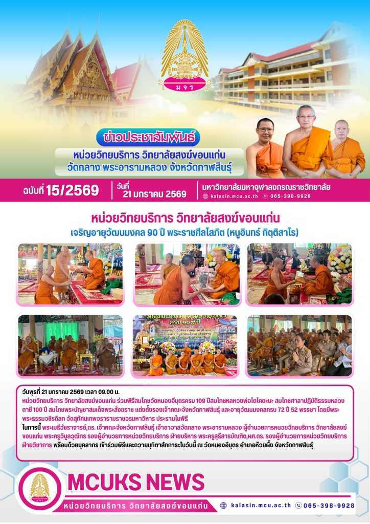 หน่วยวิทยบริการ วิทยาลัยสงฆ์ขอนแก่น ร่วมพิธีสมโภชวัดหนองอีบุตรครบ 109 ปีสมโภชหลหวงพ่อโตโคตะมะ สมโภชศาลาปฏิบัติธรรมหลวงตาชี 100 ปี สมโภชพระบัญชาสมเด็จพระสังฆราช แต่งตั้งรองเจ้าคณะจังหวัดกาฬสินธุ์ และอายุวัฒนมงคลครบ 72 ปี 52 พรรษา