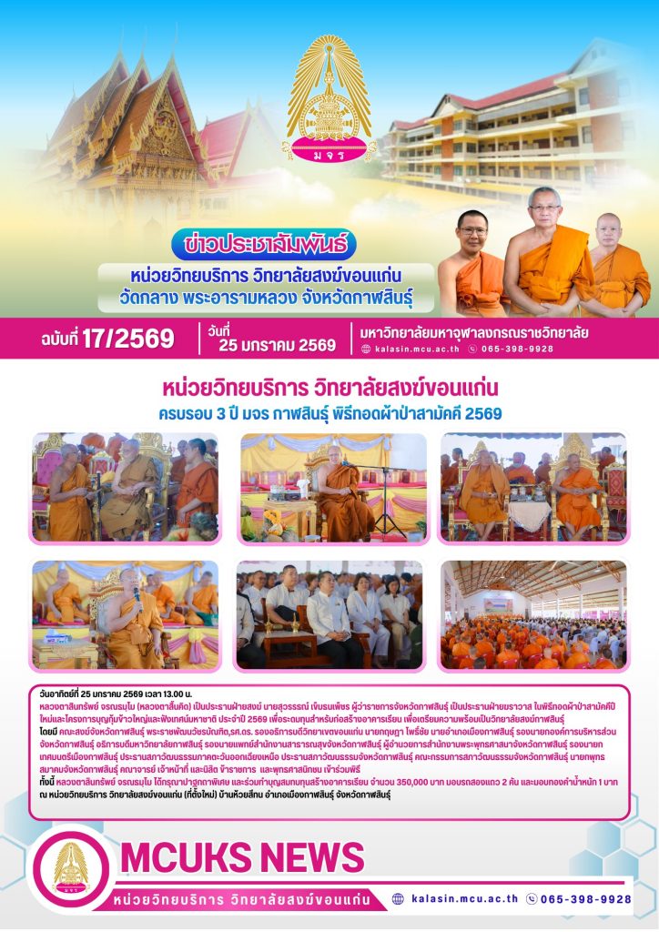 หลวงตาสินทรัพย์ จรณธมฺโม (หลวงตาสิ้นคิด) เป็นประธานฝ่ายสงฆ์ นายสุวรรธณ์ เข็มธนเพ็ชร ผู้ว่าราชการจังหวัดกาฬสินธุ์ เป็นประธานฝ่ายฆราวาส ในพิธีทอดผ้าป่าสามัคคีปีใหม่และโครงการบุญกุ้มข้าวใหญ่และฟังเทศน์มหาชาติ ประจำปี 2569 เพื่อระดมทุนสำหรับก่อสร้างอาคารเรียน เพื่อเตรียมความพร้อมเป็นวิทยาลัยสงฆ์กาฬสินธุ์